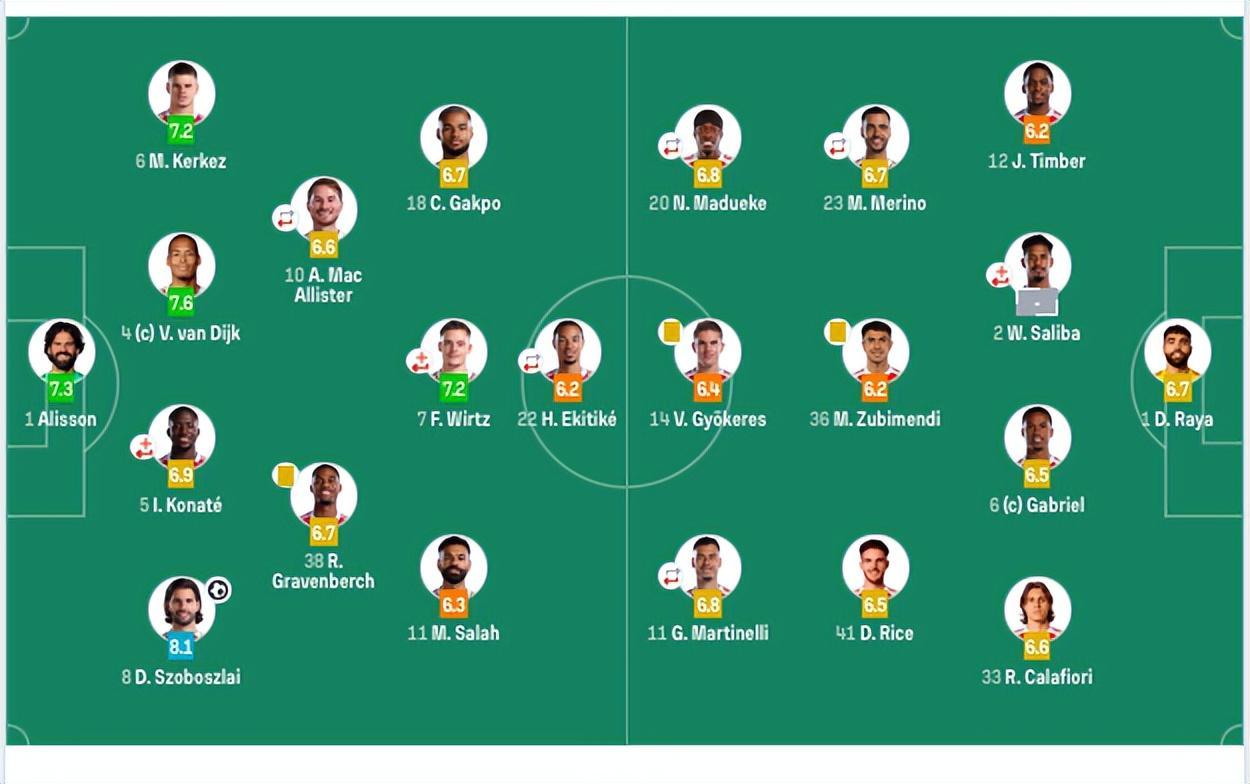 阿森纳首发:1-拉亚、2-萨利巴(5’3-莫斯克拉)、6-加布里埃尔、12-廷伯、33-卡拉菲奥里、23-梅里诺(70’8-厄德高)、41-赖斯、36-苏维门迪、11-马丁内利(70’10-埃泽)、20-马杜埃凯(89’56-道曼)、14-约克雷斯。
