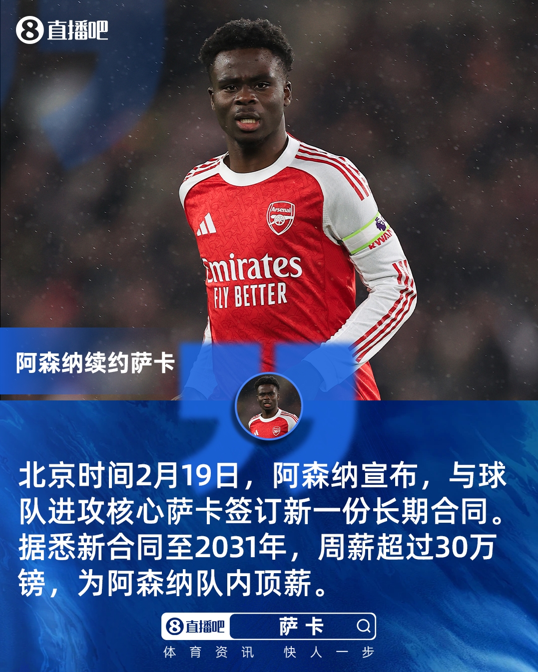 在上个月,阿森纳刚刚与萨卡续约至2031年,据媒体报道,萨卡的新合同周薪超过30万镑,是队内的顶薪。